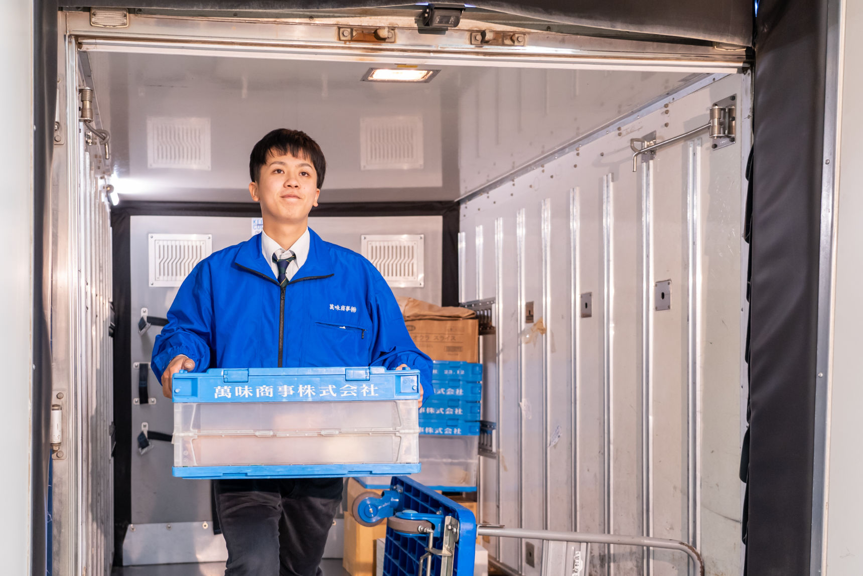 「配送」「商品提案」集金等の「顧客管理全般」になります。入社後 最初はルートセールスとしてトラックで配送業務を行いながら新商品の案内や商品提案を しながら現場最前線の萬味の“顔”として活躍してもらいます。数年後しっかり現場を経験し た後はフリー営業として広域のチェーン店のお客様の営業担当や新規開拓を行ってもらい ます。萬味商事の営業マンは「食のエキスパート」としてお客様の商売繁盛、発展に貢献 します。ただ配送を行う仕事では無いので様々な知識、スキルを磨く事が出来、とてもや りがいのある部署です。自分で提案したメニューが売れ筋商品になったりした時は何とも 言えない喜びを感じる事が出来ます!
